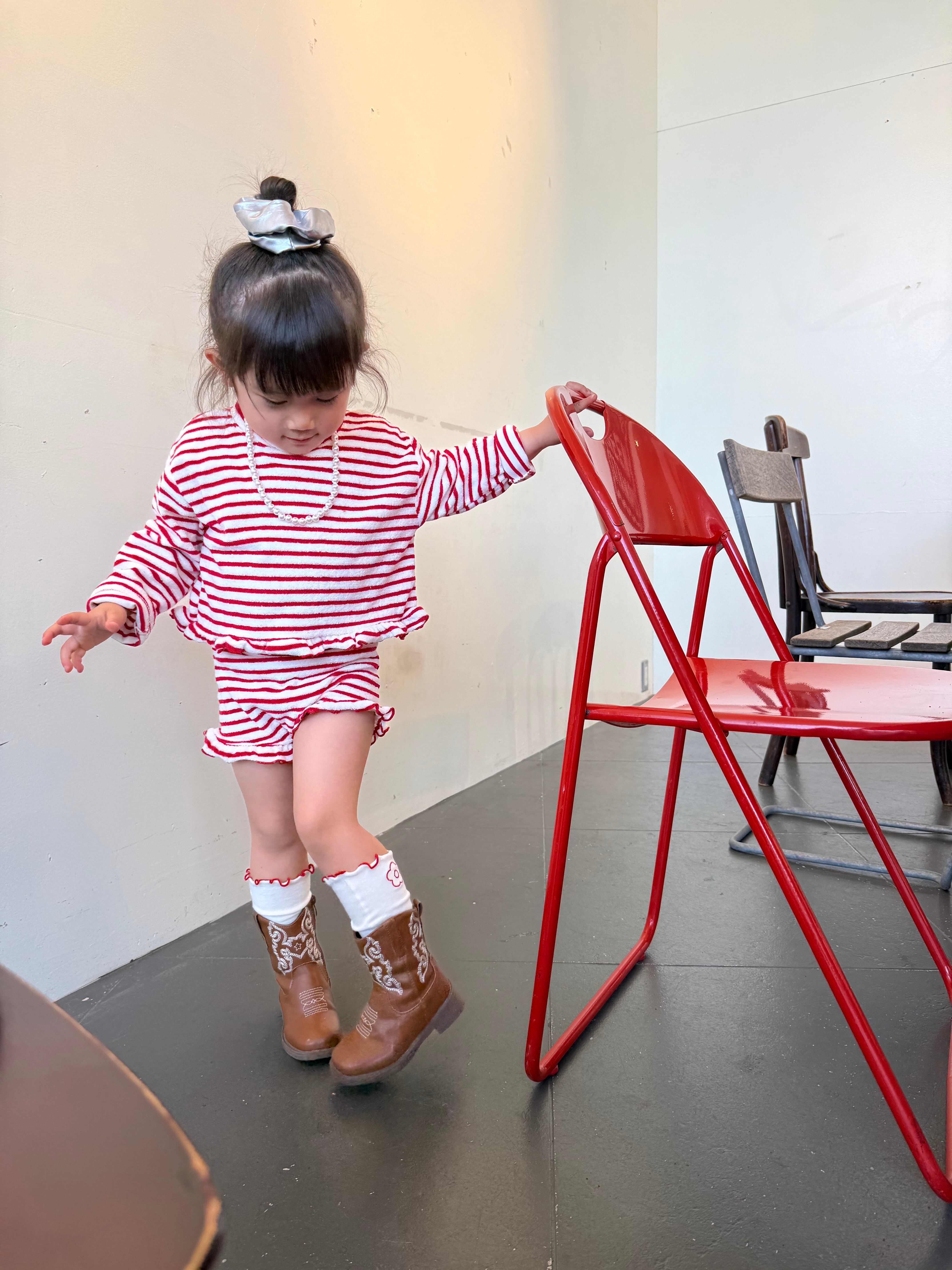 キュートな丸い刺繍が、愛らしさと可愛らしさをプラスしています