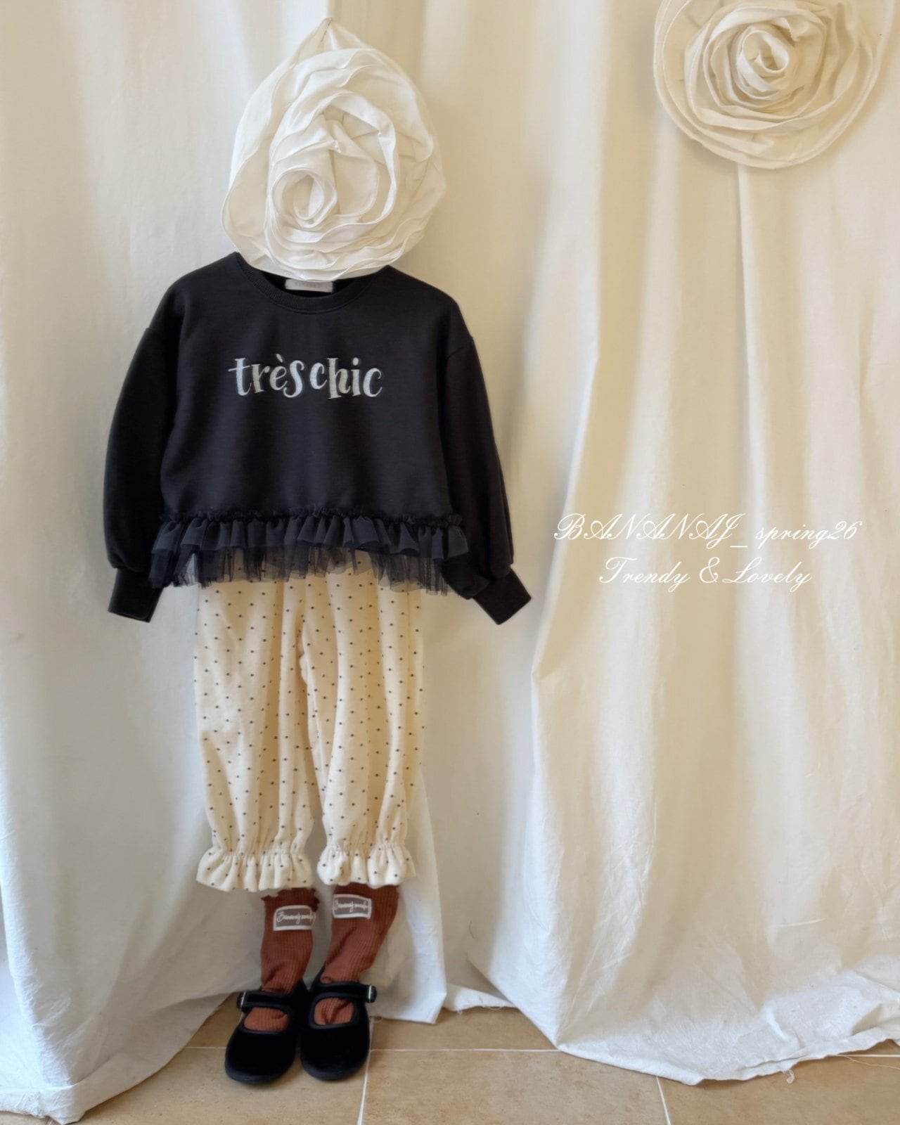 繊細な水玉模様がポイントとなり、シンプルながらも愛らしい雰囲気を演出。足首のフリルがキュートで生き生きとしたシルエットを完成させます。